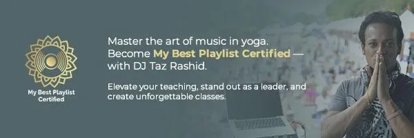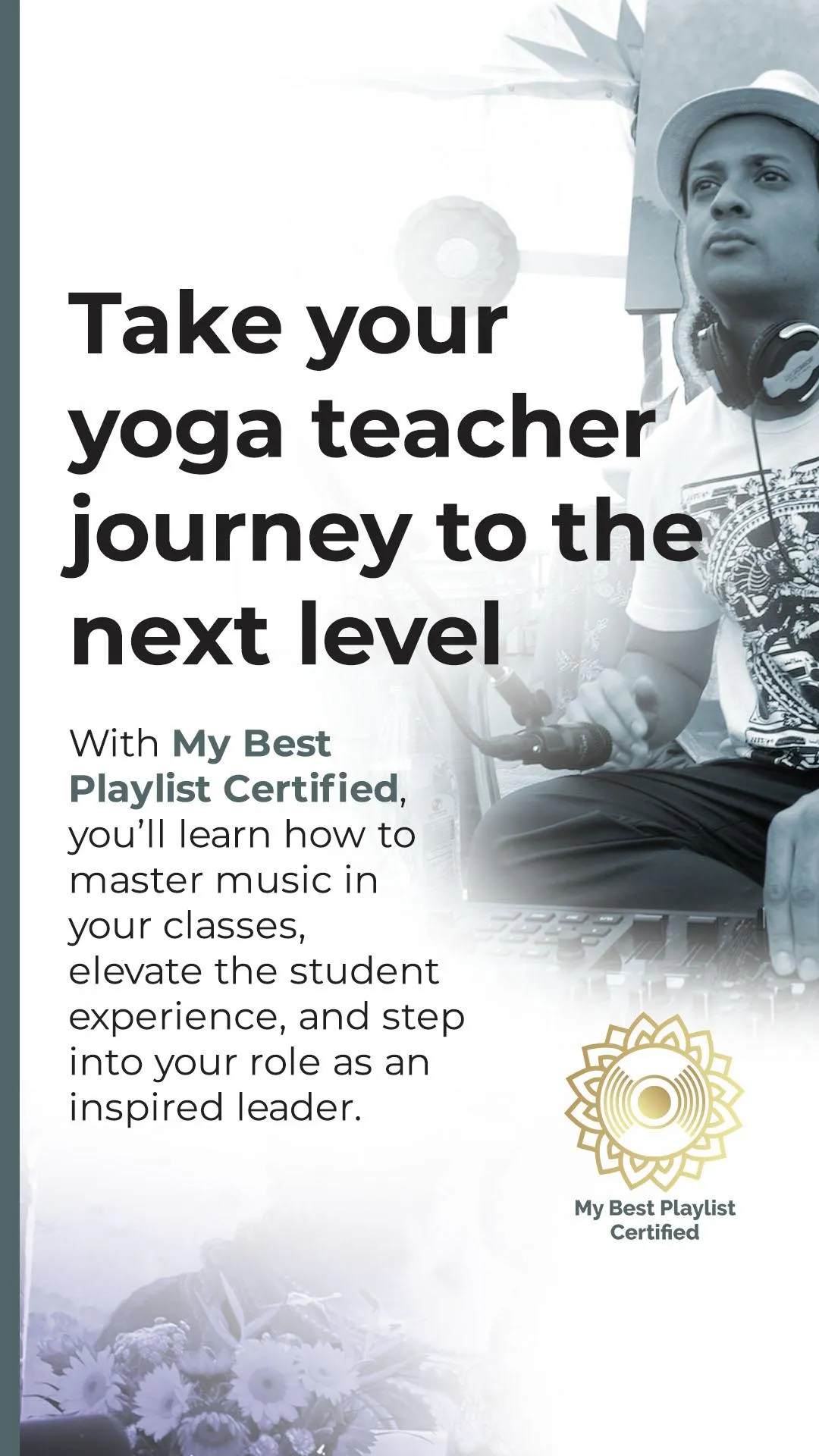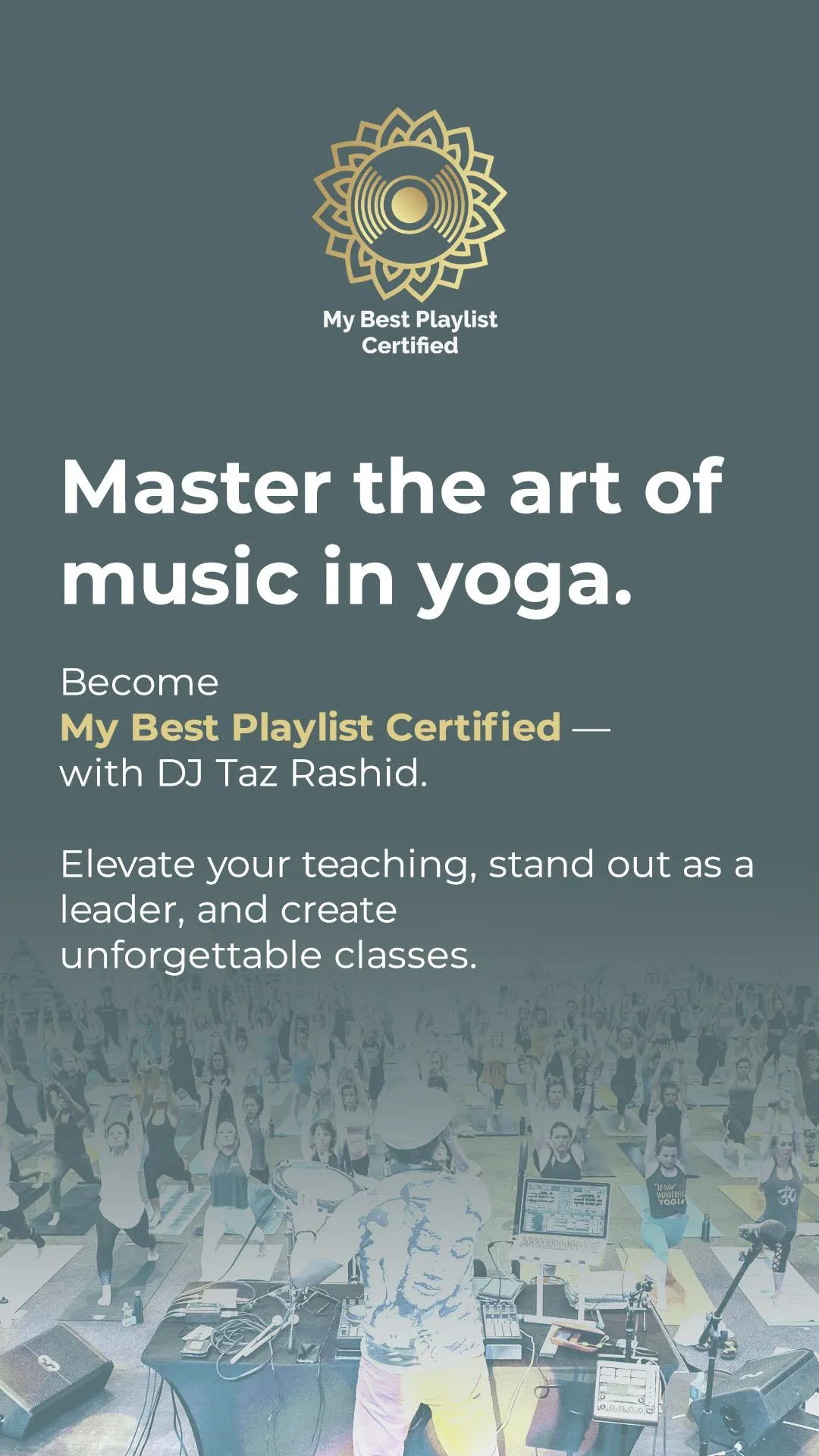 The My Best Playlist Certified program is a licensing partnership enabling yoga schools and teacher-training programs to integrate DJ Taz Rashid’s signature music-for-wellness curriculum into their courses.